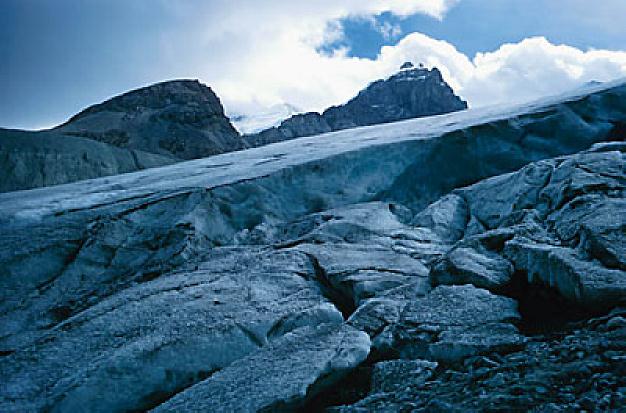 On land, snow falls and freezes into ice layers, the Ice begins to move outward. Sheets of ice extend from the mountains to the valleys, carrying beneath it much of the ash, cooled and crushed lava which solidified after the volcanic eruption has cooled. Layer upon layer of sheet ice are compressed together under new snowfall. The heavier the ice mass becomes the wider it spreads, the ices' weight causing it to expand. New snow fall in a frozen landscape forces an ice cap on a volcano to expand horizontally from pressure from above. As it expands it takes the path of least resistance and will flow into low lying valleys between mountains or along river beds. Existing rock and soil is pushed forward and to either side of the glacier's path. The low ridges that form at the base of the mountains on either side of these glacial valleys are called moraines and contribute much to what we refer to as the ‘foothills' of a mountain range.